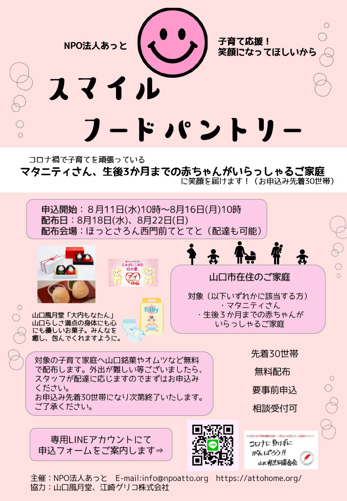 【要申込】あっとスマイルフードパントリーが始まります 2021 7/26 お知らせ参加者募集活動報告 2021.07.26 2021.07.26 赤い羽根 新型コロナ感染下の福祉活動応援全国キャンペーンの助成を受けて、NPO法人あっとが、子育て家庭へ笑顔を届ける「あっとスマイルパントリー」行います。 お知らせ参加者募集活動報告 【メディア情報】コンソーシアムの取り組みが掲載されました 【レポート】オンライン料理講座 関連記事 【参加無料】企業の労務担当者必見!両立支援と法改正対応セミナー 2025.09.19 【メディア情報】ママドラフト会議® 2020.11.27 6/1オープンのこんこんパークに「こんこんひろば」を開設します 2025.05.01 【参加企業募集】2025Woman Job con ⁺ 2025.07.03 【ママドラレポート】Re:Stepプログラムに参加した女性たちの座談会 2021.02.23 2024年山口県で出産するすべての子育て家庭のためのファミポケが発刊されました 2024.01.10 【オンライン開催】ママドラフト会議キックオフセミナーが終了しました 2020.08.28 【申込終了】2024.10/31開催 ママドラフト会議in山口 2024.06.28