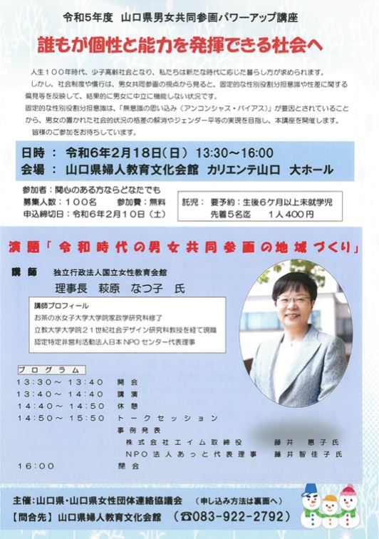 令和5年度 山口県男女共同参画パワーアップ講座で事例発表しました 2024 2/27 お知らせ活動報告 2024.02.27 2024.04.04 山口県、山口県女性団体連絡協議会主催のパワーアップ講座で事例発表、トークセッションを行いました。 講師の独立行政法人国立女性教育会館萩原理事長と、山口県の男女共同参画事業をけん引されてきた女性団体の皆さんから元気とパワーをいただきました! お知らせ活動報告 企業版赤ちゃんふれあい体験を実施しました 寄付金をいただきました 関連記事 【2022年度リステッププログラム】参加女性の募集スタート 2022.05.25 【10/23(木)募集開始】 赤ちゃん×白石中学校「ふれあい体験事業」2025 2025.10.14 レノファ✖️あっとの子育て応援企画!ホームゲームでキッズルームを設置します 2024.07.31 【メディア情報】6/8開催マタニティウェルカムデイ 2025.06.09 2022ママドラフト会議in山口を開催しました 2022.10.28 ファーストリテイリング/レノファ山口FC連携事業「マタニティウェルカムデイ」を開催します 2025.04.21 【開催方法変更】Re:Stepプログラム「スタートアップ講座」 2021.08.27 【オンラインレクチャ】子育て親子のためのはみがきレッスン 2020.05.01