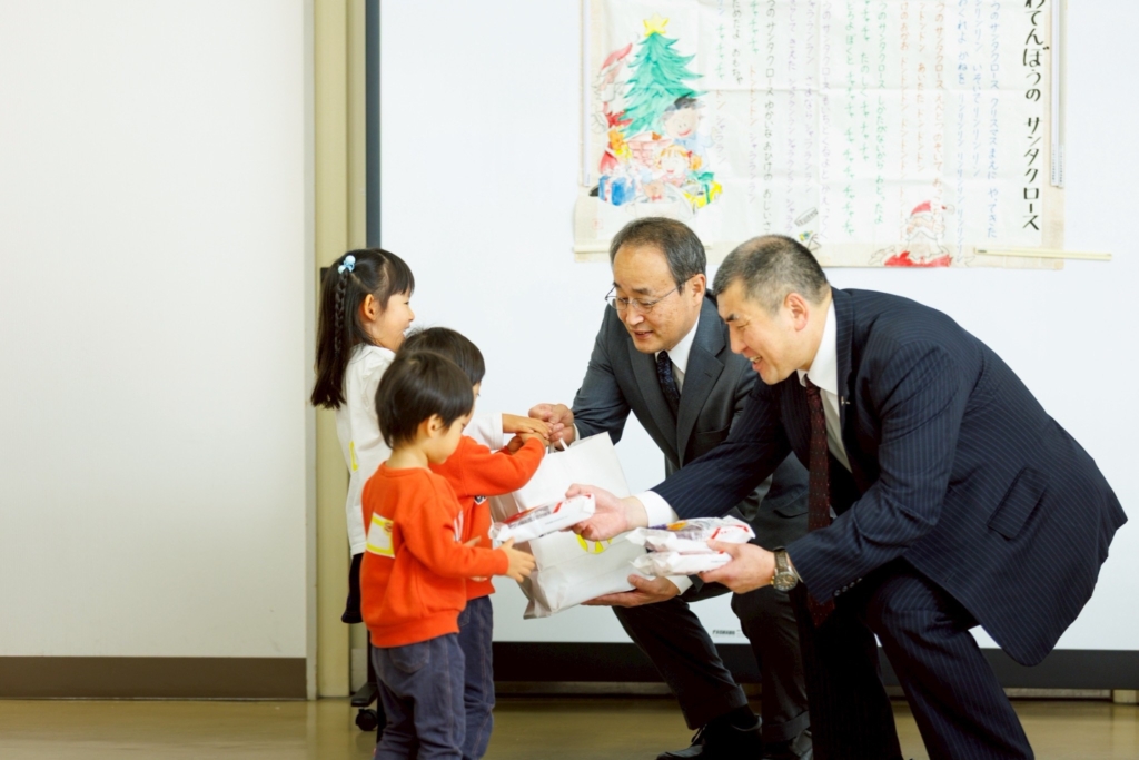 クリスマスプレゼントとして、地元企業・株式会社丸久様より、多胎児のお母さんお父さん、そして子どもたちを応援する食支援パントリーの寄付をいただき、贈呈式を行いました。